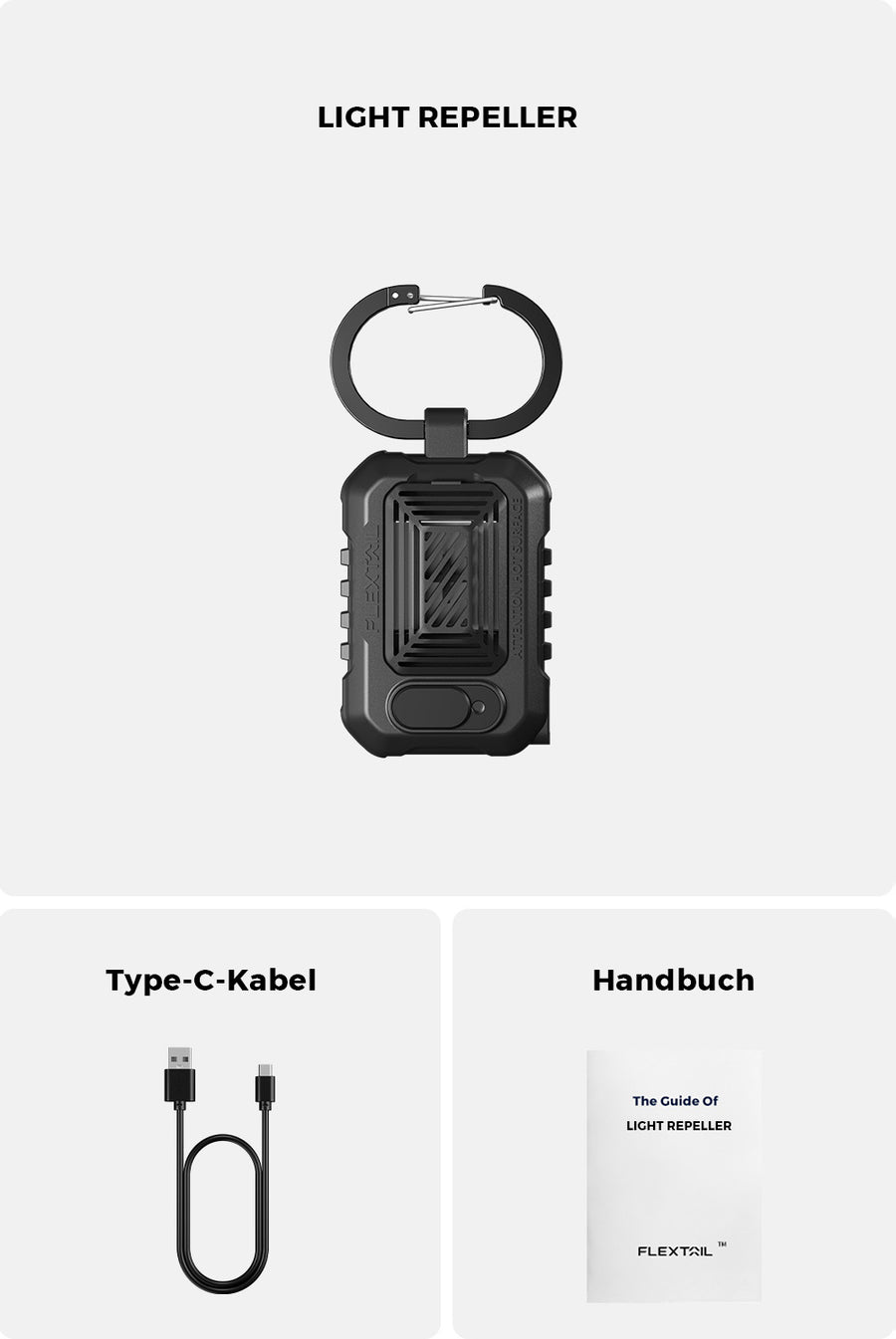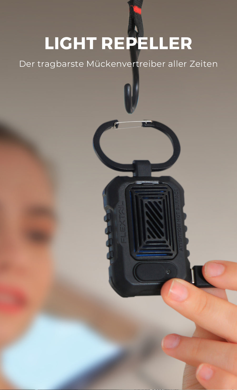 Ein ideales Outdoor-Werkzeug muss kleiner, tragbarer und leichter zu tragen sein. Das Mückenschutzmittel LIGHT REPELLER ist näher am Leben im Freien. Es ist mit einem Haken ausgestattet, sodass Sie LIGHT REPELLER überall aufhängen können, z. B. an der Brust, am Rucksack, im Zelt usw. Warten Sie, warten Sie, warten Sie! Das Light Repel-Abwehrmittel wird auch mit einem vertikalen Haken geliefert, sodass es frei auf dem Tisch stehen kann, was es praktischer macht. LIGHT REPELLER – Überlegen Sie, woran Sie denken können!