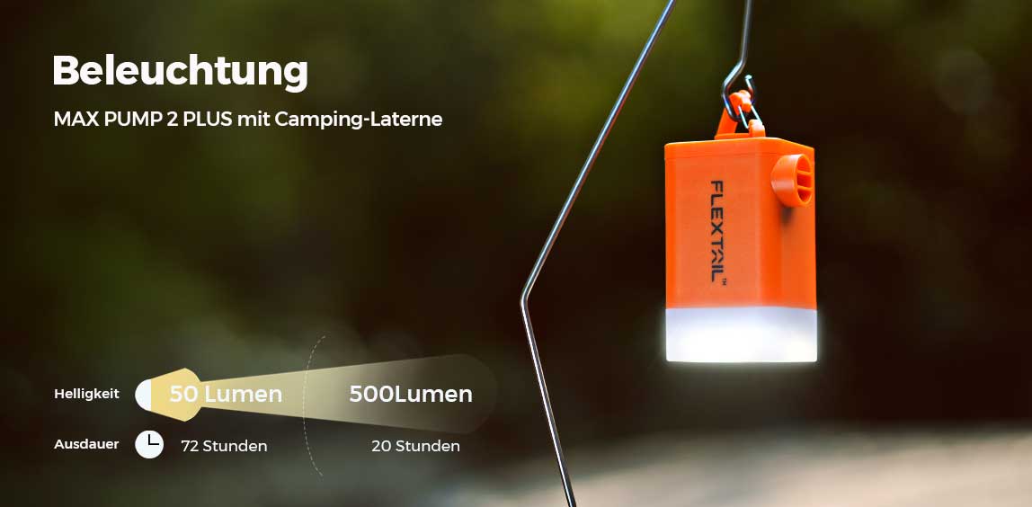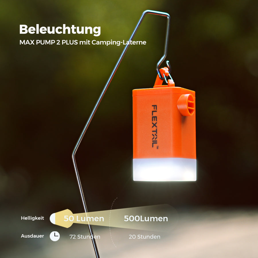 MAX PUMP 2 PLUS bietet stufenloses Dimmen, um Ihren unterschiedlichen Lichthelligkeitsanforderungen besser gerecht zu werden. Mit 500 Lumen auf höchster Stufe hält es bei hoher Helligkeit bis zu 20 Stunden und bei niedriger Helligkeit (50 Lumen) bis zu 72 Stunden.