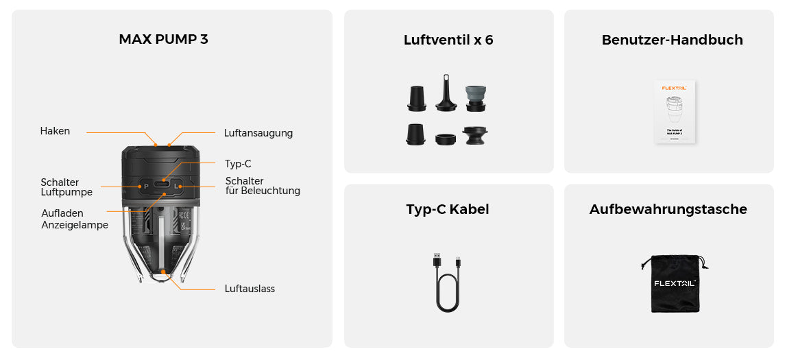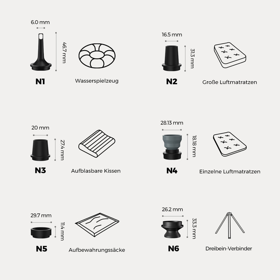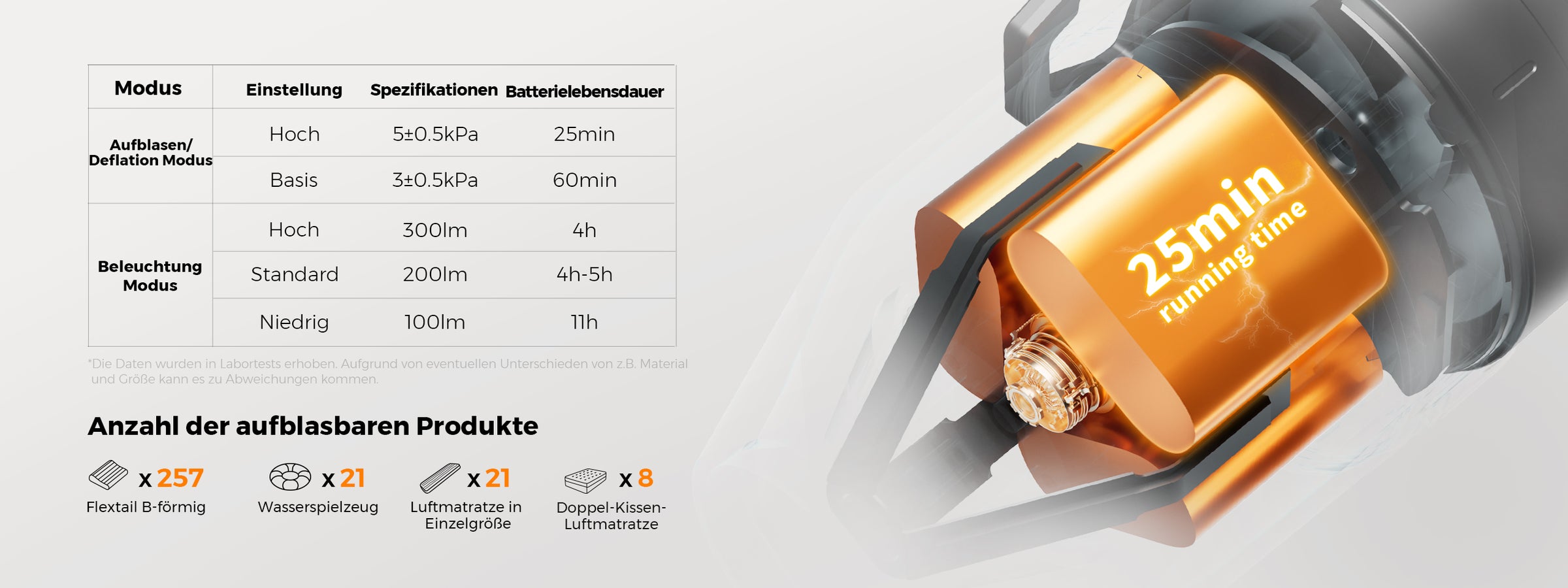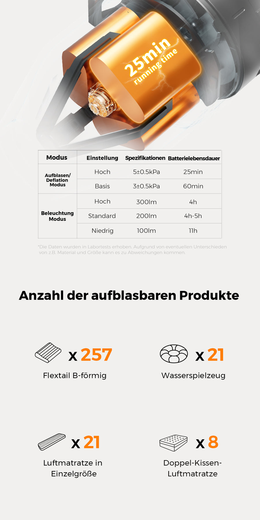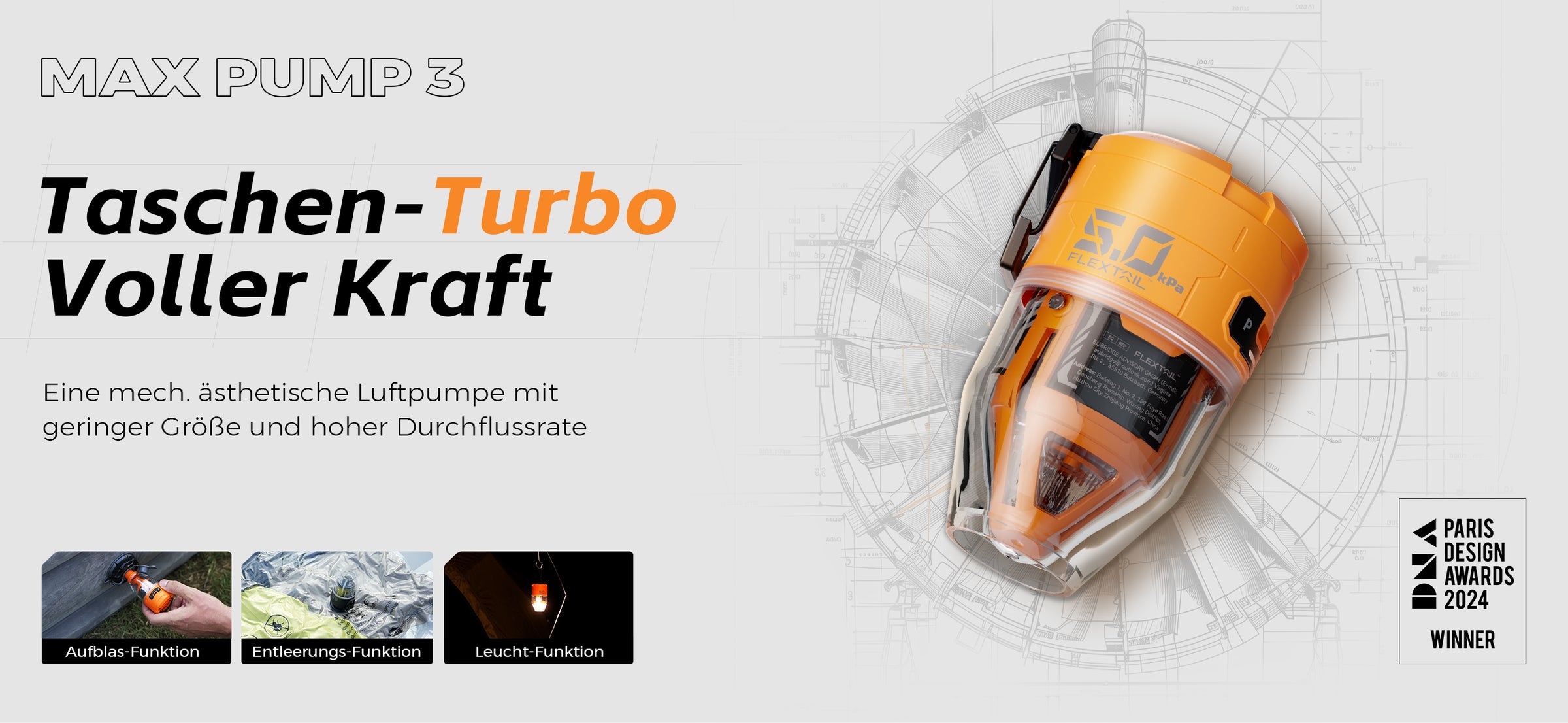 MAX PUMP 3 liefert einen starken Druck von 5 kPa und eine hohe Luftdurchflussrate von 500 l/min. Egal, ob Sie eine Campingmatte, eine Schwimmhilfe oder ein aufblasbares Spielzeug aufblasen, diese Pumpe erledigt die Arbeit schnell und effizient. Verabschieden Sie sich vom Ärger des manuellen Aufblasens – Max Pump 3 bläst selbst die größten Gegenstände in nur wenigen Minuten auf und spart Ihnen so Zeit und Mühe.