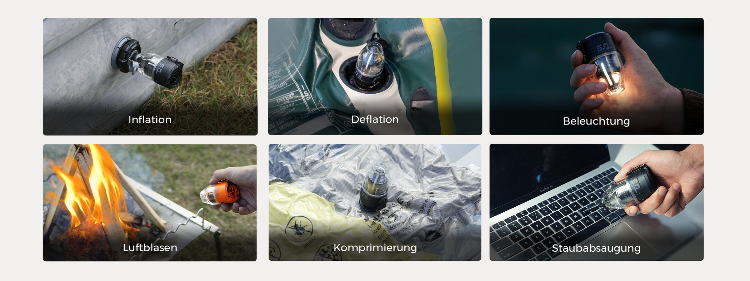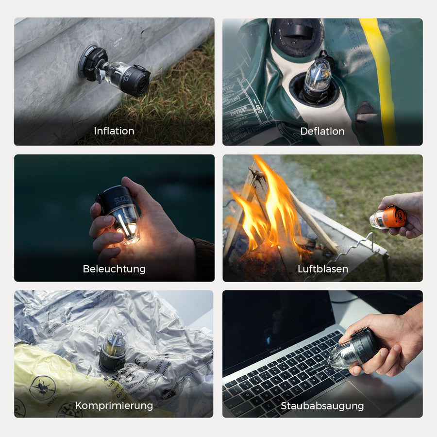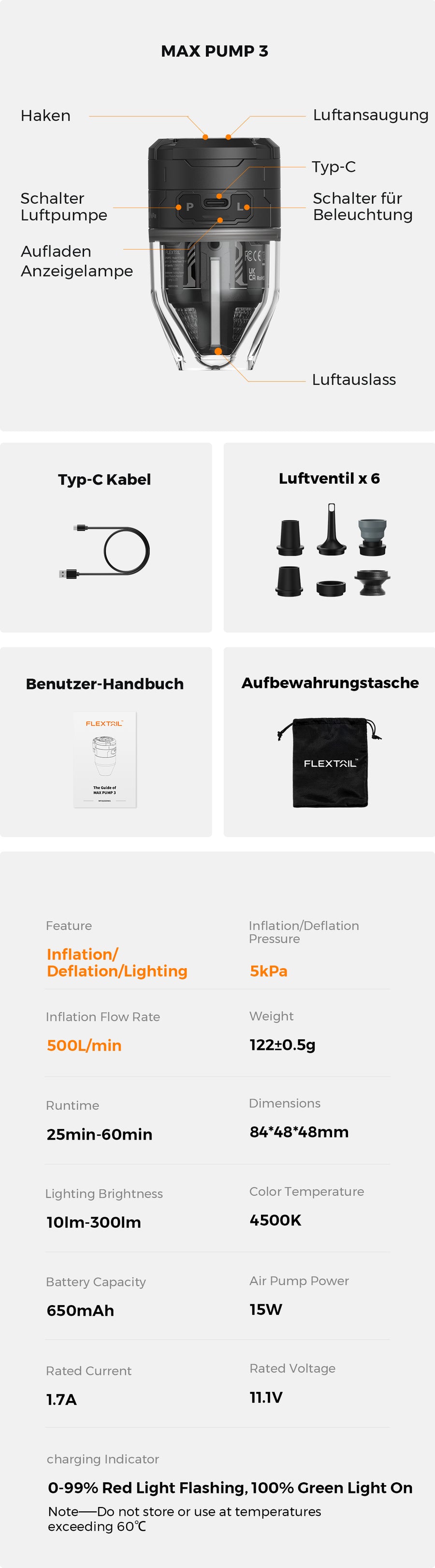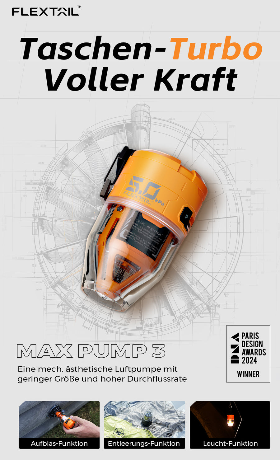 MAX PUMP 3 kombiniert starke Leistungskraft mit leichtem Tragekomfort bei nur 122 g (4,3 oz). Mit einem integrierten LED-Licht dient MAX PUMP 3 sowohl als Pumpe als auch als Lichtquelle, perfekt für einfaches Tragen bei Outdoor-Aktivitäten und auf Reisen, ideal für Camping, Wandern, Angeln und mehr.