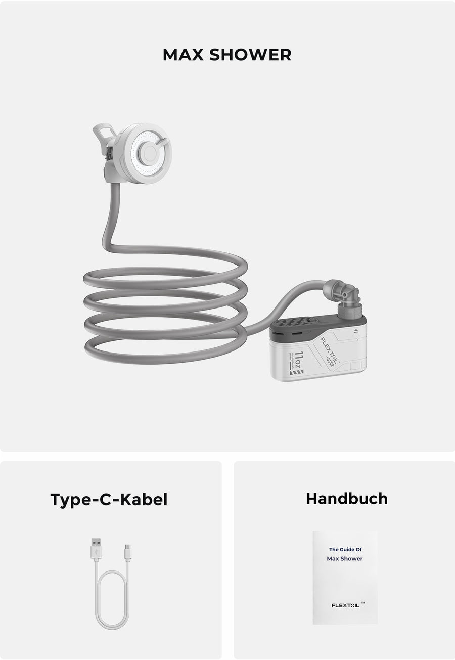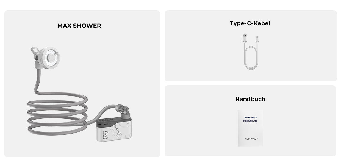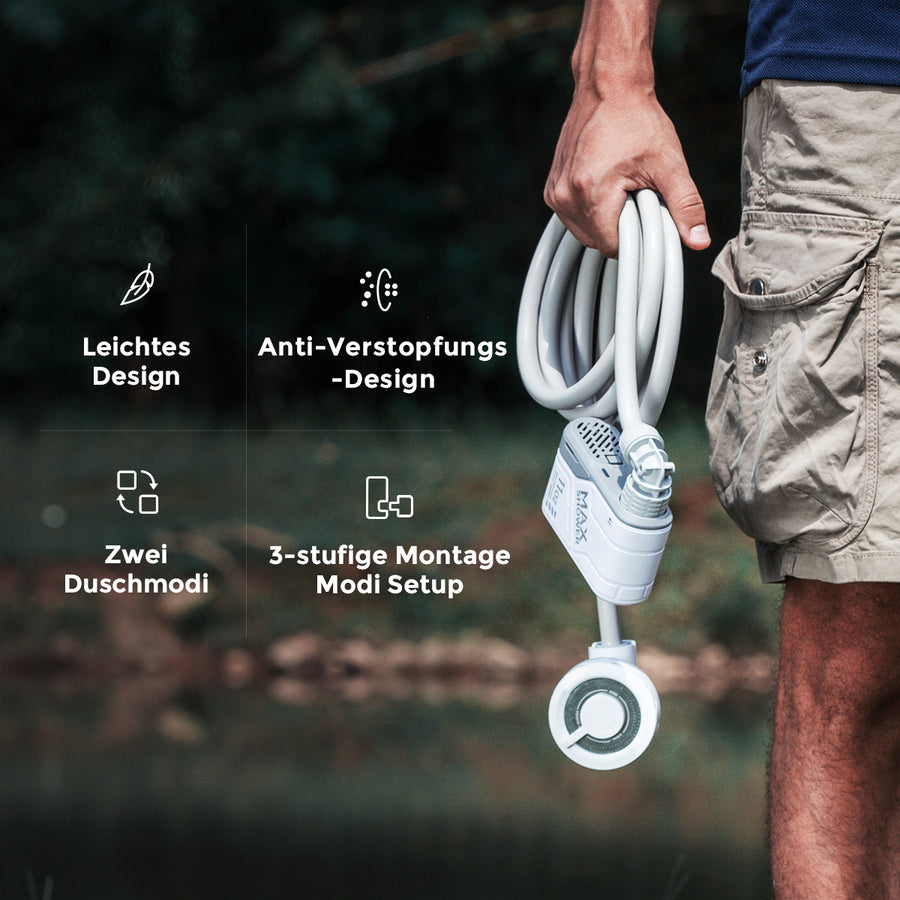 Die Einrichtung Ihrer MAX-Dusche ist ein Kinderspiel. Es sind keine komplexen Installationen oder Werkzeuge erforderlich.