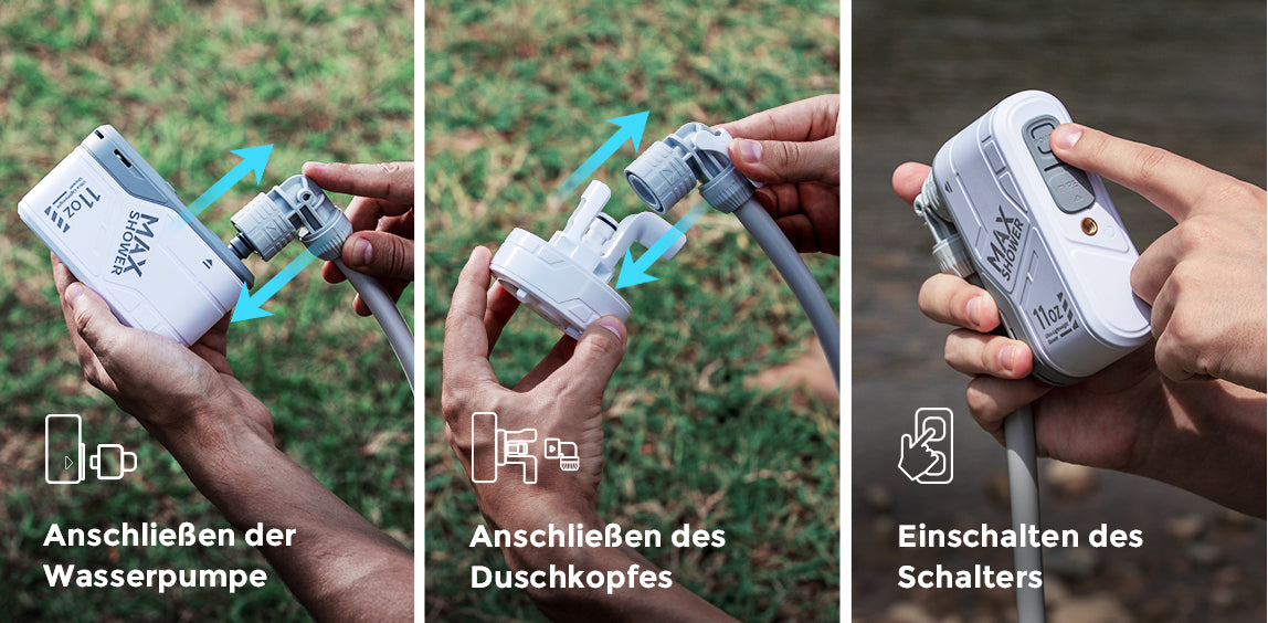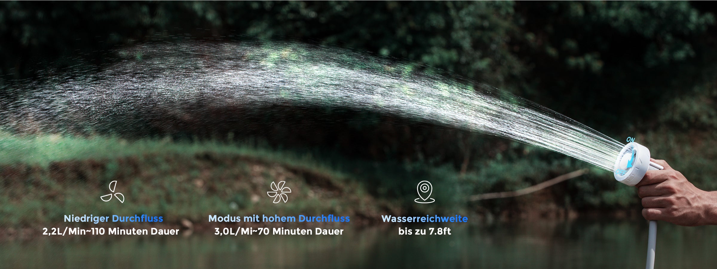 Tauchen Sie die Pumpe einfach in eine Wasserquelle, wählen Sie den gewünschten Modus und die gewünschte Dauereinstellung und genießen Sie eine erfrischende Dusche.