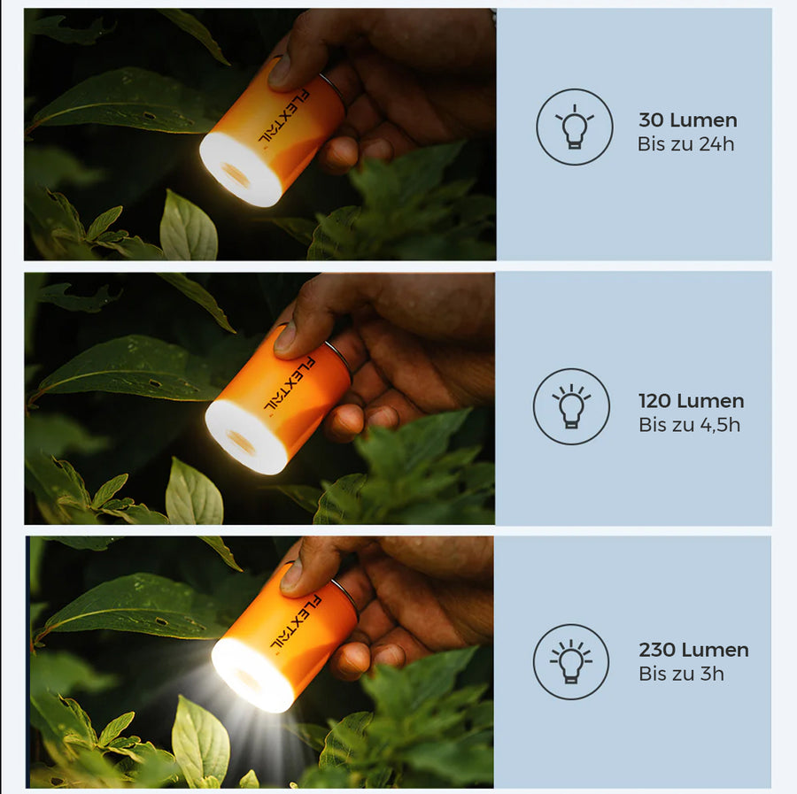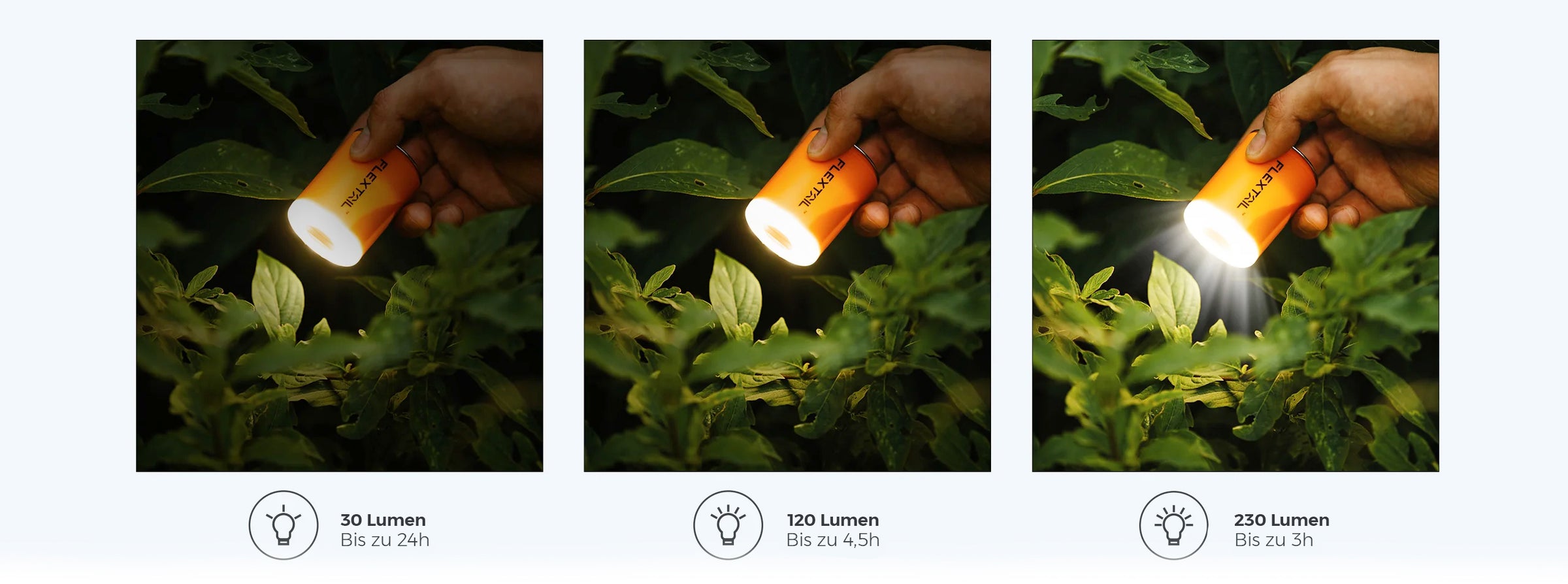 Zum Einschalten drei Sekunden gedrückt halten. Die drei Helligkeitseinstellungen (230 Lumen / 120 Lumen / 30 Lumen) sorgen überall für das gewünschte Licht: beim Camping, Wandern, Radfahren oder Grillen im Garten. Die Beleuchtung kann bis zu 24 Stunden anhalten.