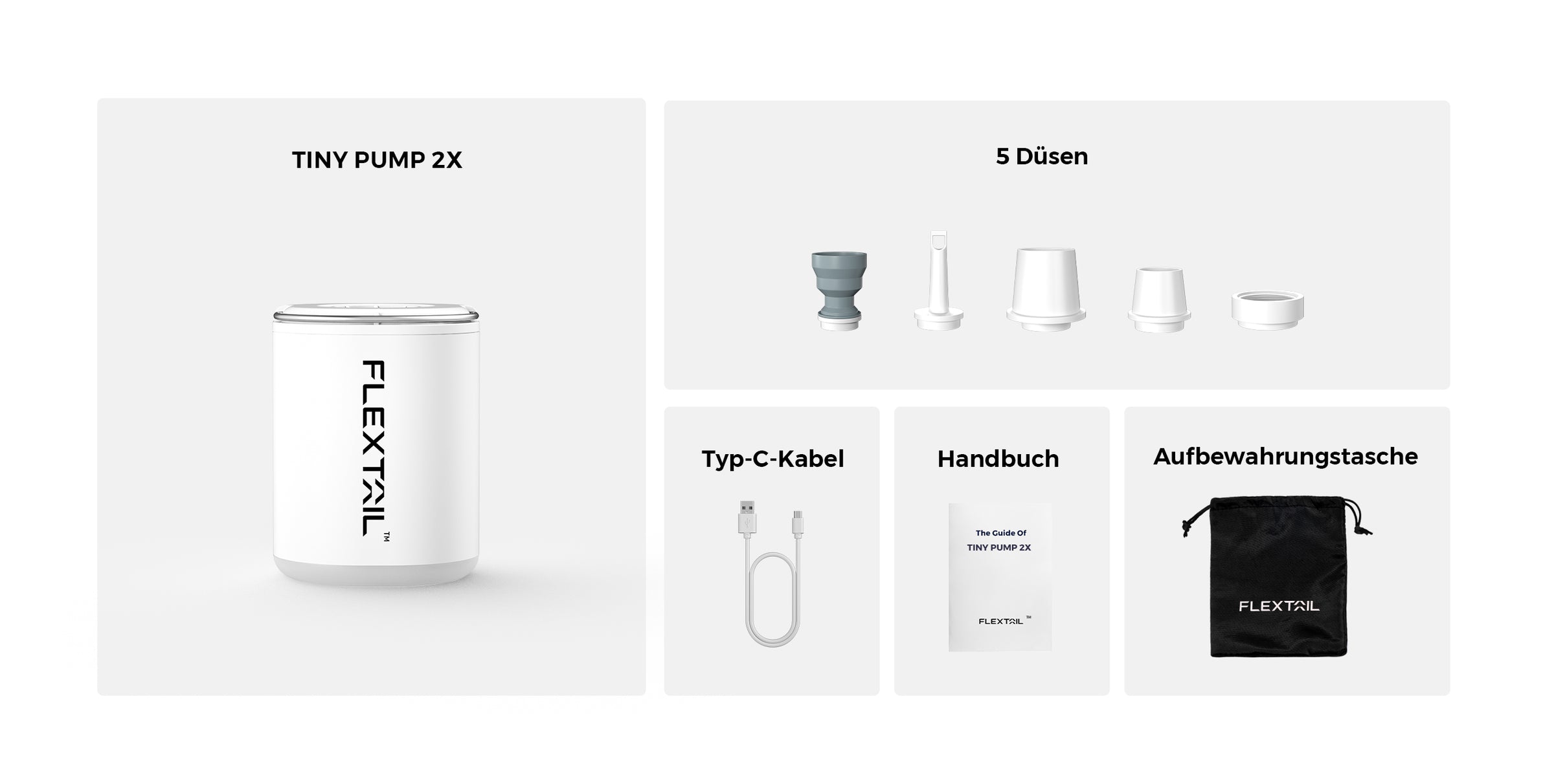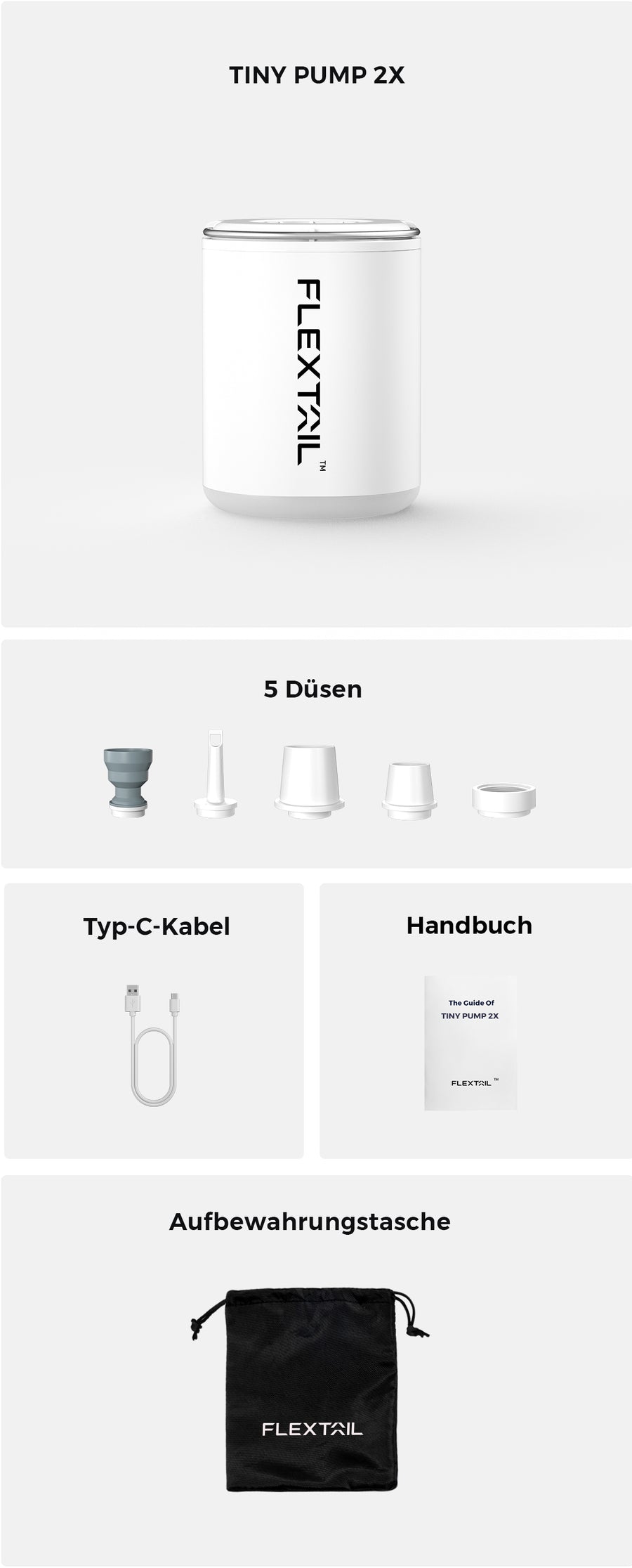 TINY PUMP 2X verfügt über 5 Düsen und ist somit für verschiedene aufblasbare Produkte wie Luftmatratzen, Schwimmhilfen und aufblasbare Möbel geeignet. Es unterstützt sowohl das Aufblasen als auch das Luft-Entleeren von allen aufblasbaren Produkten mit Ventil.