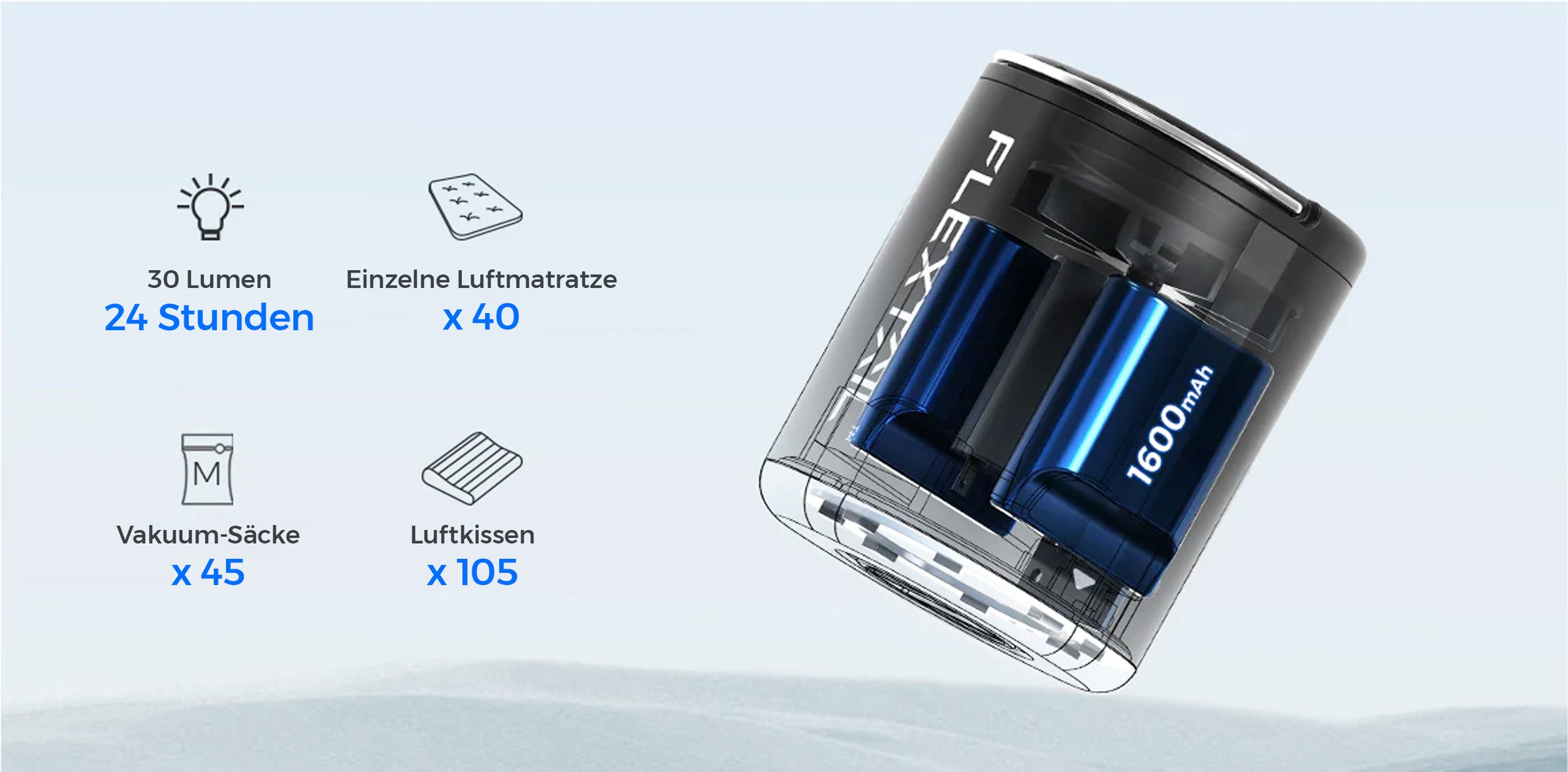 TINY PUMP 2X eingebaute wiederaufladbare 1600mAh-Akkus funktionieren über den Ladeanschluss Typ C nach vollständigem Aufladen bis zu 30 Minuten lang für das Aufblasen von über 105 Luftkissen oder 24 Stunden Beleuchtung pro Ladung. Genießen Sie kabellosen Komfort für den Einsatz unterwegs. Praktische Ladeanzeigen: grün für fertig aufgeladen und rot für 0-99 % Batterie-Status.