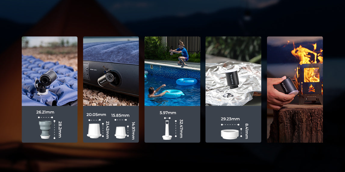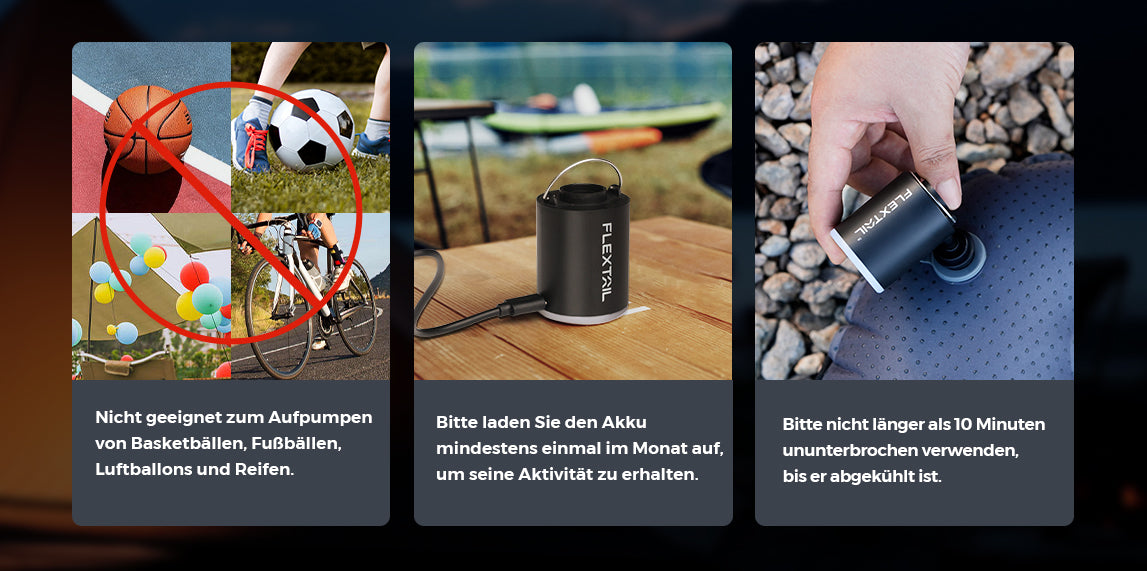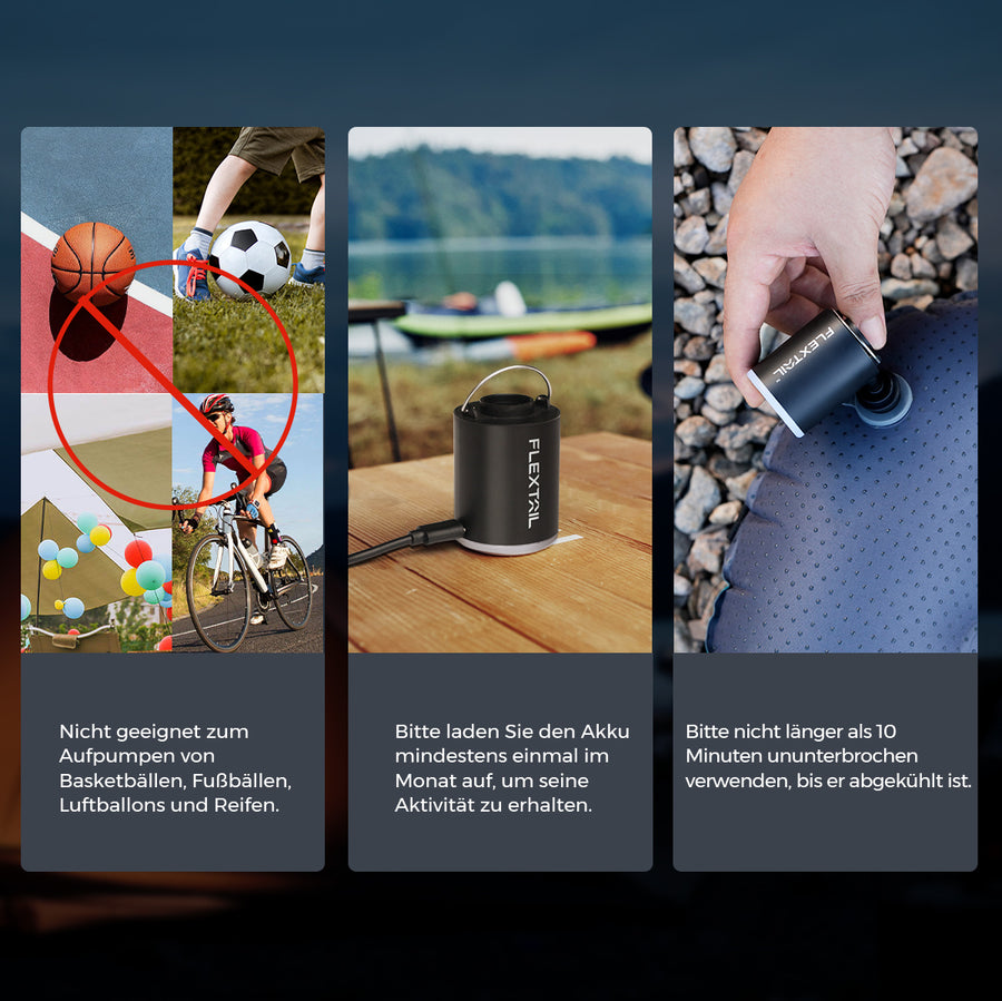 Der Luftdruck von 4 kPa und die Luftgeschwindigkeit von 180 l/min ermöglichen der winzigen Luftpumpe von FLEXTAIL ein schnelles Aufblasen oder Entleeren. Gute Luft-Sättigung auch nach dem Aufblasen. Kann nach der Aufladung bis zu 12 Schwimmringe, 10–15 Camping-Isomatten oder 1–2 dicke Luftkissen aufblasen oder 15–20 Aufbewahrungsbeutel vakuumieren.