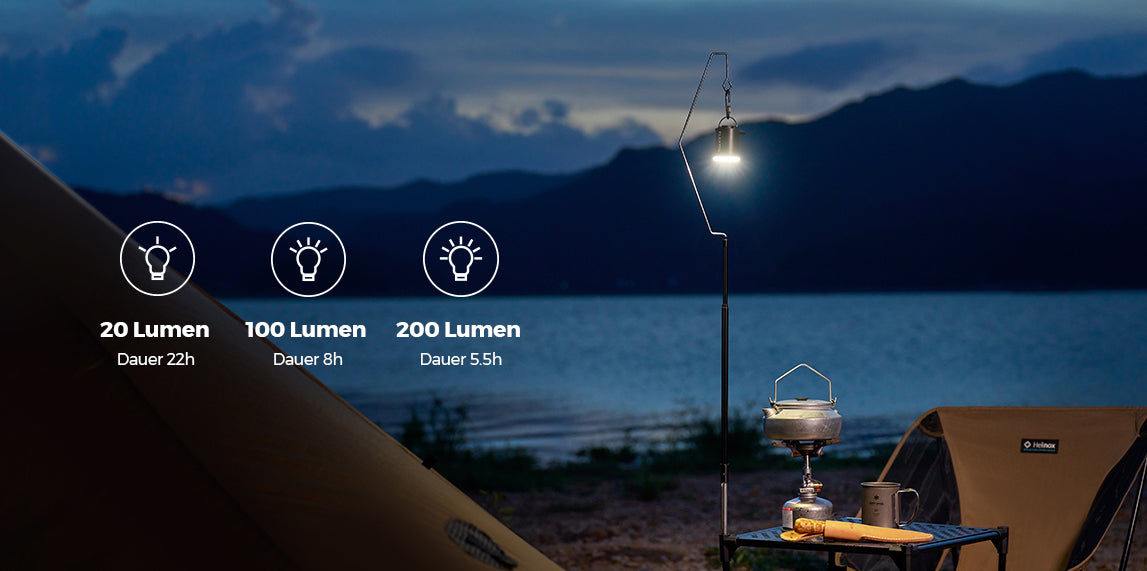 Zum Einschalten drei Sekunden gedrückt halten. Die drei Helligkeitseinstellungen (200 Lumen/100 Lumen/20 Lumen) sorgen überall für das gewünschte Licht und die Beleuchtung kann bis zu 22 Stunden anhalten.